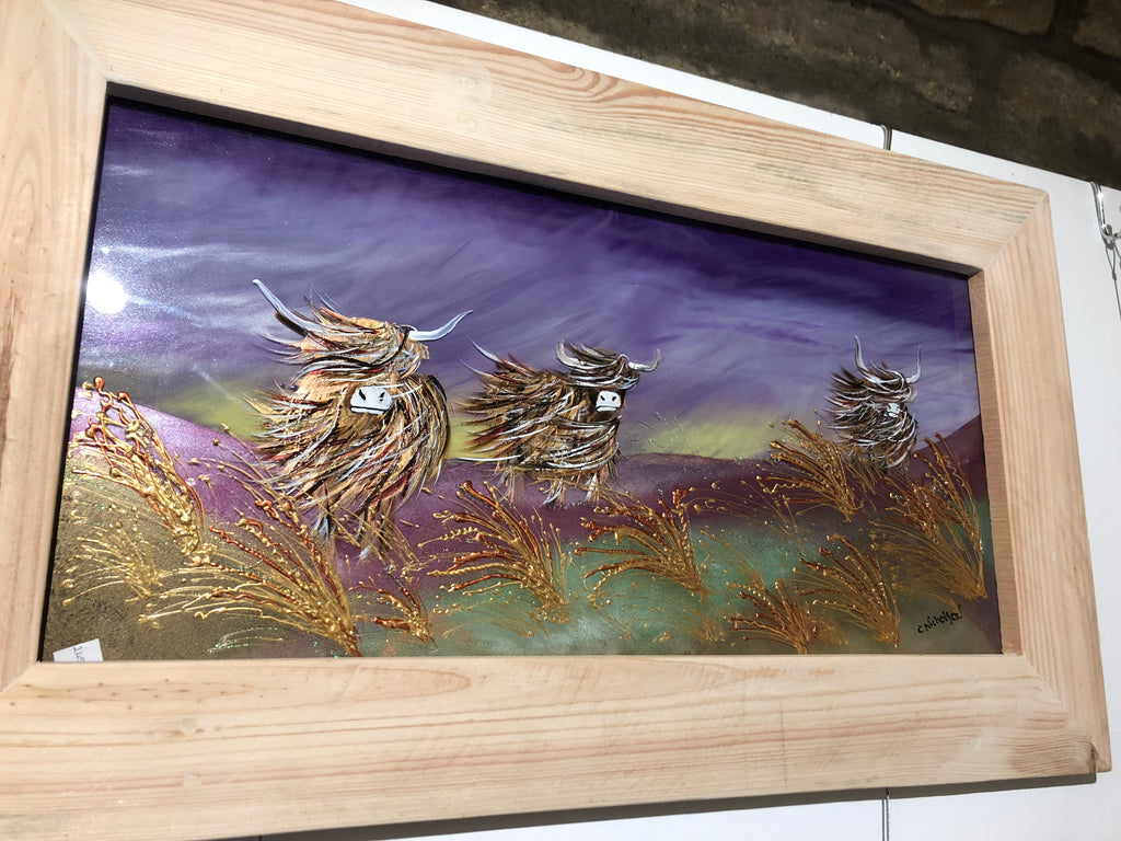 Stunning hand painted glass picture depicting the ever popular highland cattle, this is an original design, hand painted with great attention to detail and holds an embossed finish in the grasses with light reflective paint this is set off in a hand made frame, the frame is made from reclaimed timber we spend a long time on the frames to give a perfect finish, perfectly ok to stain or wax, a hand made frame finished size 34 x 19 inch