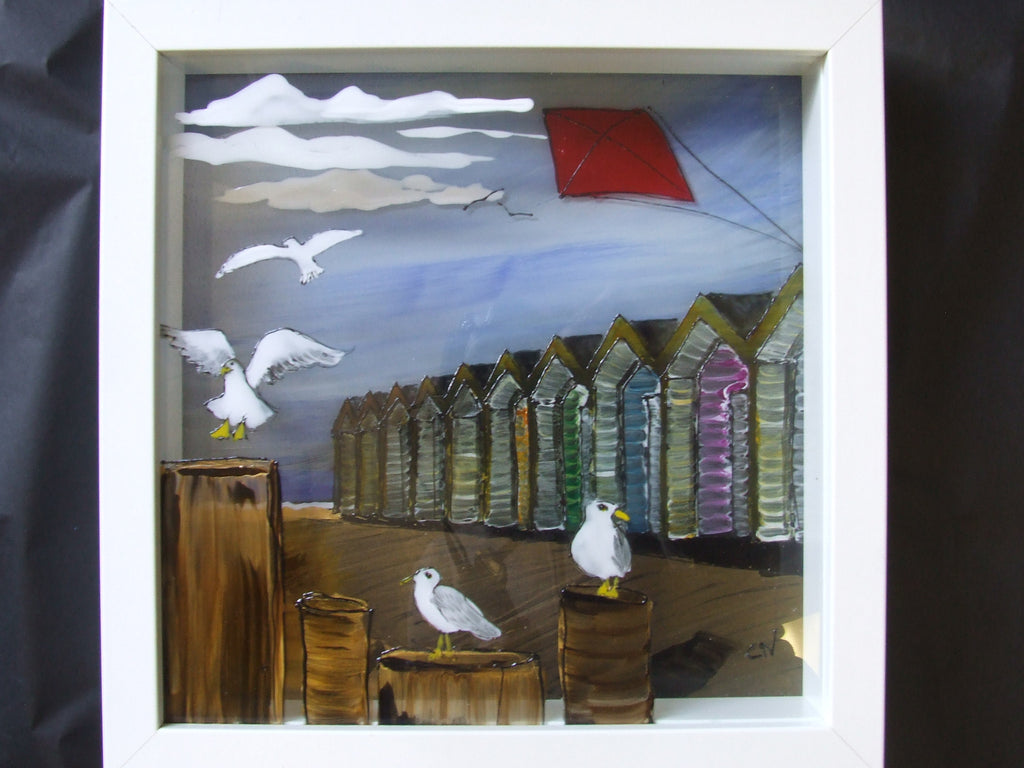 12 inch x 12 inch, 3d picture, 2 inch wide, hand painted on 4 sides with a spacer between the 2 panes of glass giving a stunning 3d image of a Northumberland coastal  scene complete with seagulls and Blyth  Beach huts in the background,