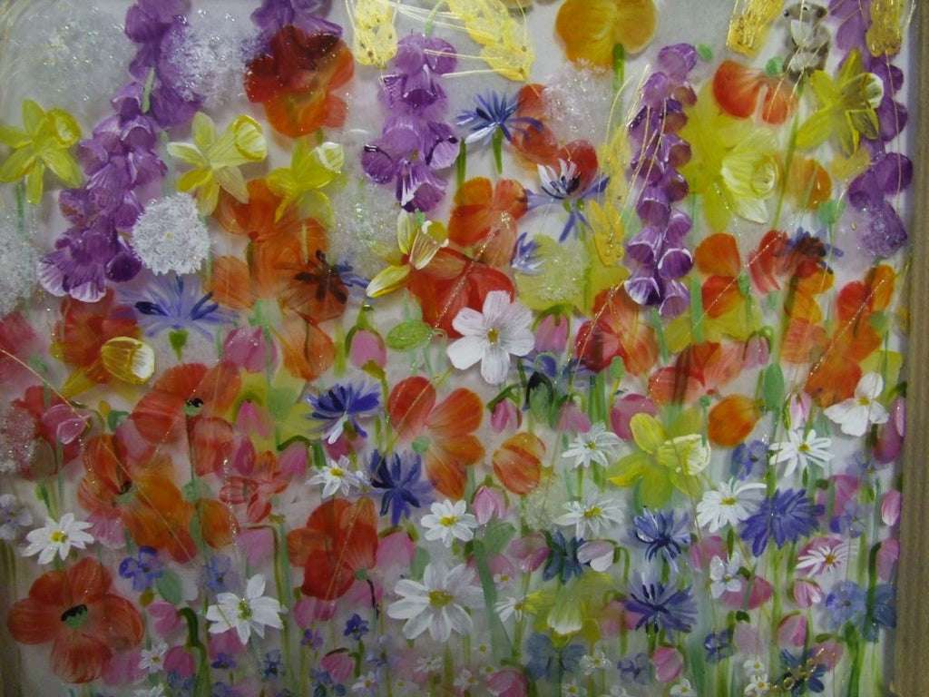 Stunning glass hand painted picture, individually hand painted, the design created gives a 3d effect, light reflective, original and framed in our own hand made frames. Made form reclaimed wood the frames enhance each picture, and look fantastic on plain walls as well as hanging in a window or back lit.