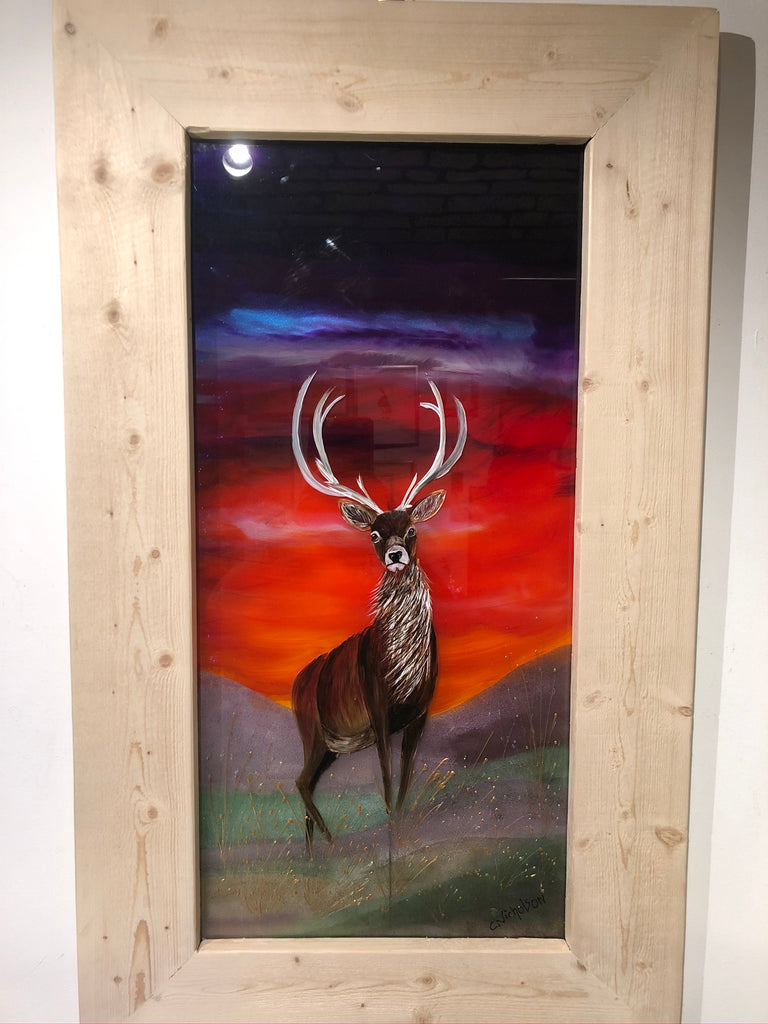 Stunning hand painted glass picture depicting a stag on a fell, serene and contemporary, will fit i with most decor and make a stunning addition to any home, set in our own , carefully , hand made frame. 36 inch x 18inch .