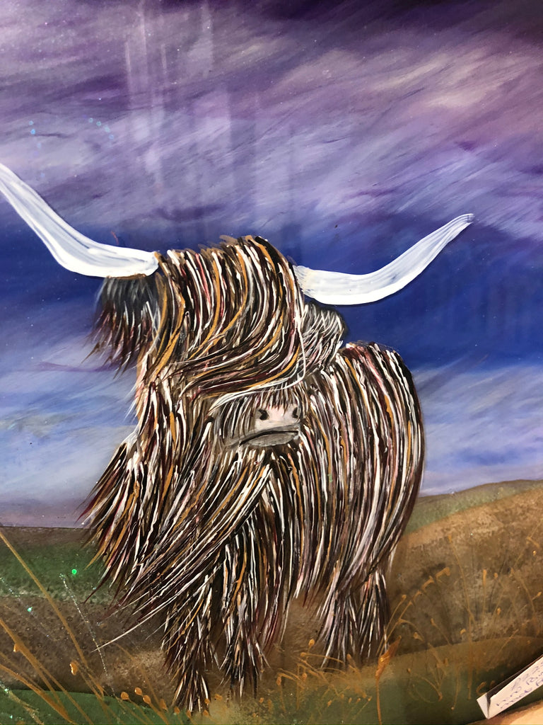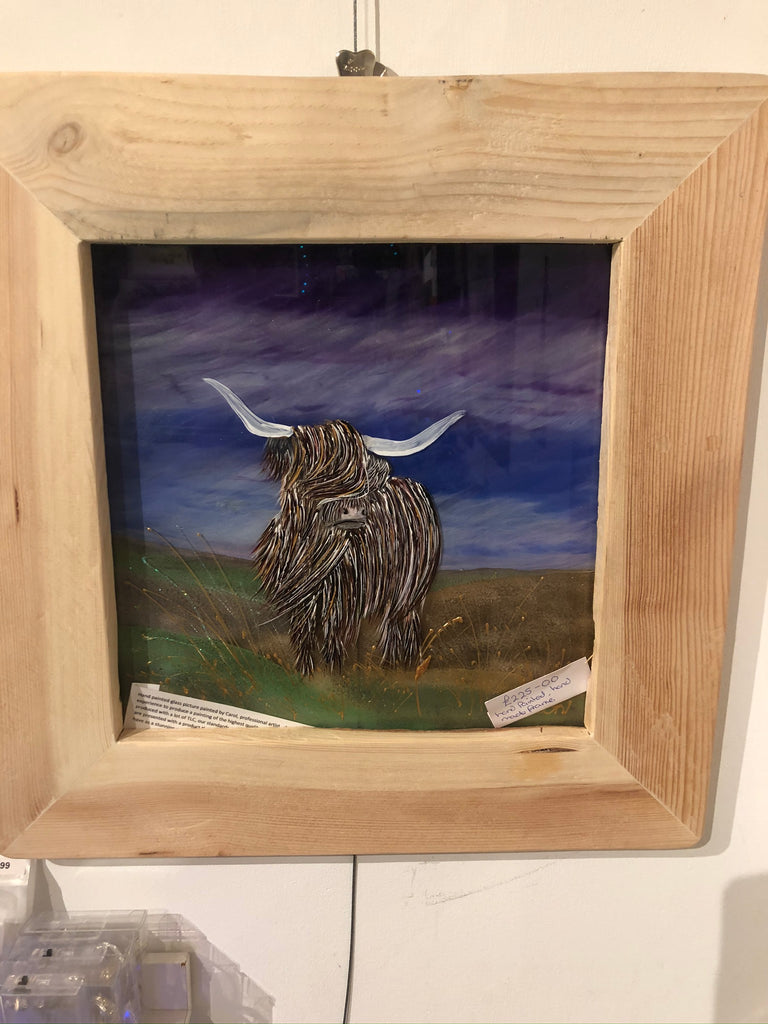Stunning hand painted glass picture, Hettie! Stood on a windy fell, highlighted with light reflective paint , this gives the picture a fabulous look in any light , framed in our own carefully hand made frame , framed size 18 inches x 18 inches