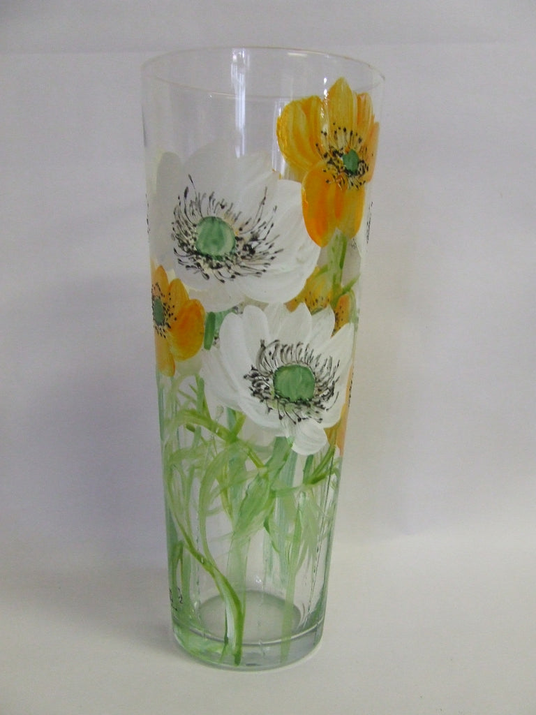 hand painted vase 60cm, tall cylinder shaped, Anenomes and spring flowers, heat treated