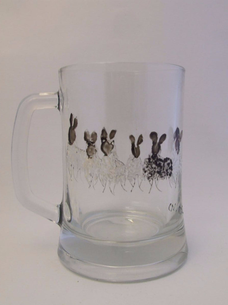 Hand painted tankards, one pint, quality glass, embossed sheep including the black sheep