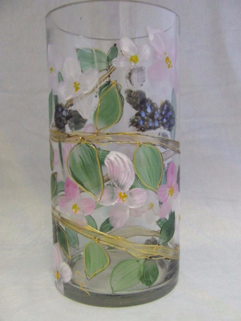 hand painted vase 60cm, tall cylinder shaped, Anenomes and spring flowers, heat treated