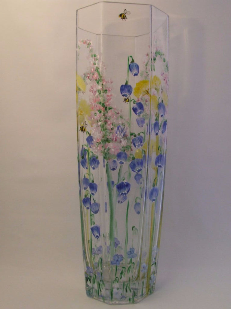 hand painted vase 60cm, tall cylinder shaped, Anenomes and spring flowers, heat treated