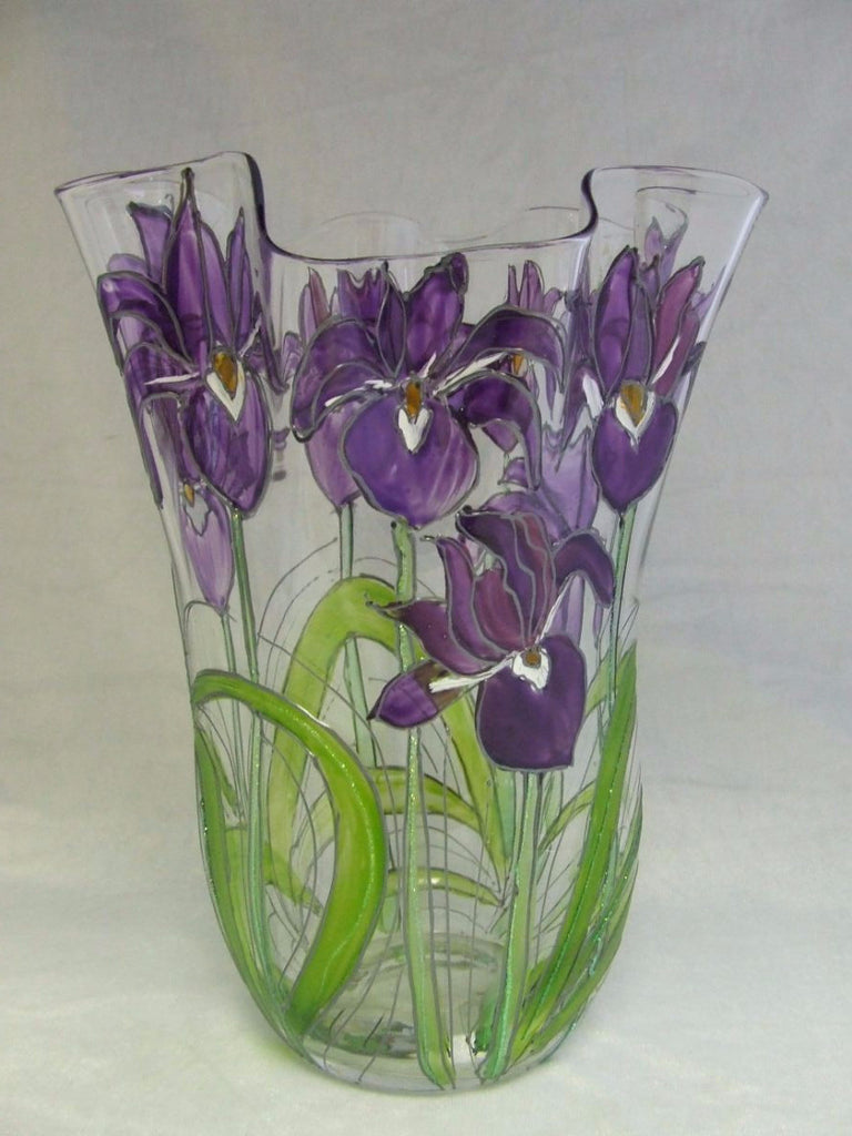 20cm x 28cm, fluted iris vase, ideal for a full boquet, or a stand alone piece of art hand painted lovley purples and green