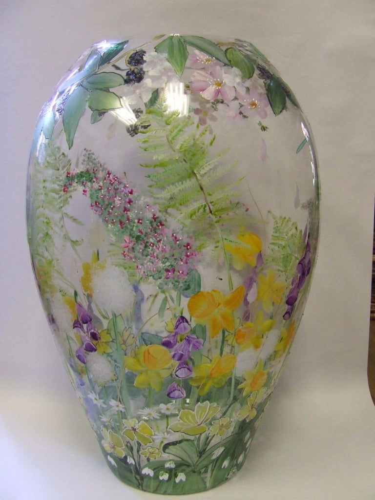 hand painted vase 60cm, tall cylinder shaped, Anenomes and spring flowers, heat treated