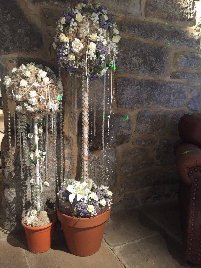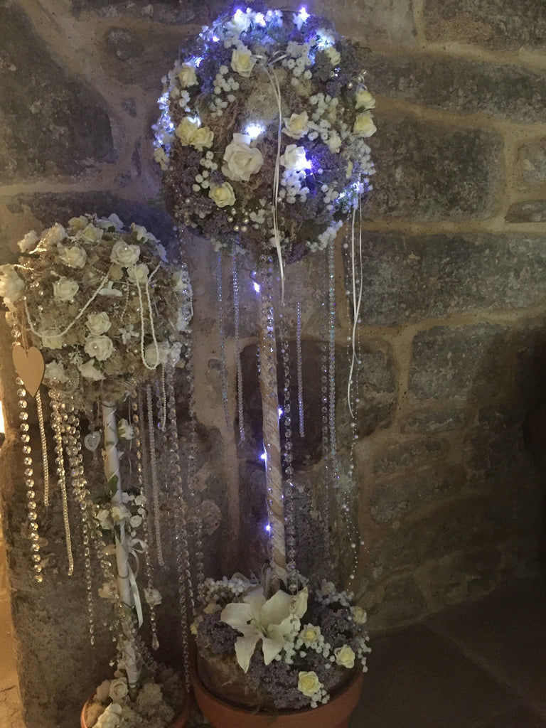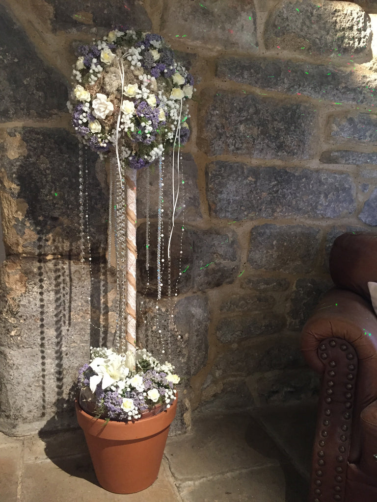 What an Entrance!! fabulous hand made pom pom trees, for sale or to hire, each tree can be individually designed to suit your requirements.  any size from table top to large out door entrance lobby, any quantity, and any style and colour to suit your occasion, weddings a speciality, the trees shown are  - larger one is 5 ft and the other one is 4 ft, they are adorned with 12 mtrs of crystal garland, studded with pearlized buttons, crystal hearts, beads, ribbon and cream roses , the body is covered in Norwegian moss and purple coverage, the whole tree is lit with led battery operated lights for great effect.  the out side terracotta pot will be personalised for you and hand painted as a lovely keepsake.  Price is for purchase of the 5ft tree, the hire cost is £50.00 for a day, based on collection,  delivery available at an additional cost the day before occasion. The personalised terracotta pot is £35.00  Please contact us direct with any questions for your specific requirements.