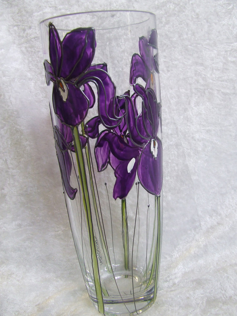 beautifully hand painted vase , purple irises, outlined in pewter to compliment the colour of the flowers, 11 inches high , 4 inches wide tapering down to 3 inches at the base