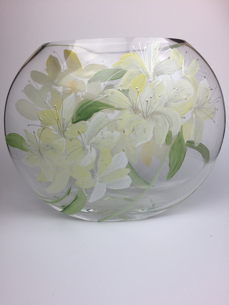 beautifully hand painted oval vase, depicting silver lilies in a contempary style, fits in with most décor, silver, pewter and shimmer, flat vase so it sits well on tables and sills 10inch high, 13inch wide, 4 inch deep