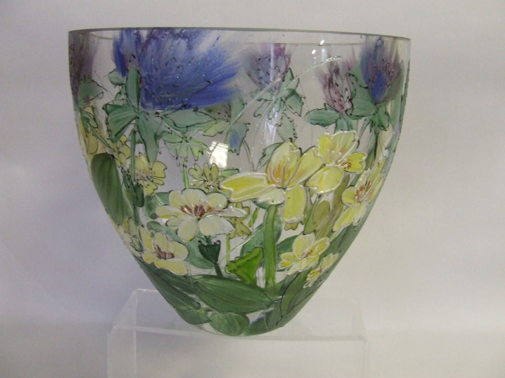 heavy glass bowl, 7 inch x 7 inch with a tapered bottom, beautifully hand painted with Primroses and Thistles